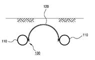 이때, 상기 추진 강관(120)은 관로 형성을 위해 사용하는 대형 강관이고, 상기 가이드 강관(110)은 상기 추진 강관(120)을 안내 지지할 수는 있는 정도의 직경을 갖는 소형 강관으로, 여기서 대형 강관과 소형 강관은 당업자들에 통용되는 통상의 크기로 이해하면 된다. Here, the propelled