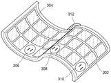 도 3을 참조하면, 본 발명의 일 실시예에 따른 전기 자동차의 휴대용 충전 장치에 포함되는 광발전 패널 모듈은 유연한 소재로 이루어지는 기판(302) 및 기판(302) 상에 배치되는 다수의 광발전 전지(304)를 포함한다. 광발전 전지(304)는 태양광을 흡수하여 전력을 생산하는 소자로, 폴리실리콘과 같은 소재로 이루어질 수 있다. 유연한 소재로 이루어지는 기판(302)을 포함하는 도 3의 광발전 패널 모듈은 접히거나 구부러질 수 있다.