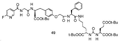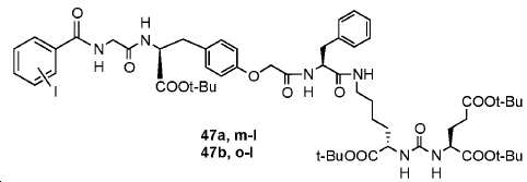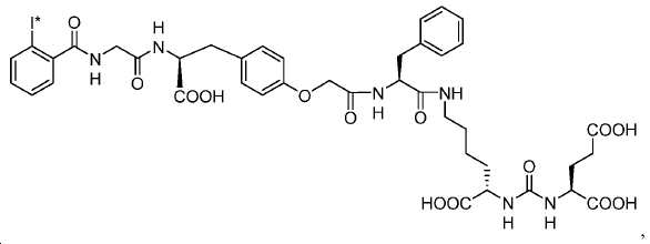 우레아계 리간드 시스템 (Glu-NH-CO-NH 또는 Glu-NH-CO-NH-Lys(Ahx))을 이용하는 몇몇 가능한 PSMA-표적화 영상화제, 가령 SPECT 영상화제: [123I]MIP-1072, [123I]MIP-1095 [49-51], [99mTc]MIP-1404, 및 [99mTc]Tc-MIP-1405 (도식 3)가 임상 연구에 포함되었다. II상 임상 연구 결과는 이들 SPECT PSMA 영상화제가 전립선 및 다른 연관 충실성 종양의 진단을 위해 적절함을 시사한다.Several possible PSMA-targeted imaging agents using a urea-based ligand system (Glu-NH-CO-NH or Glu-NH-CO-NH-Lys (Ahx)), such as SPECT imaging agents: [ 123 I] MIP- 123 I] MIP-1095 [49-51], [ 99m Tc] MIP-1404, and [ 99m Tc] Tc-MIP-1405 (Scheme 3) were included in the clinical study. Phase II clinical studies suggest that these SPECT PSMA imaging agents are appropriate for the diagnosis of prostate and other connective tissue tumors.
