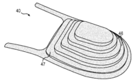 챔버들은 또한, 튜브 형상의 용융 또는 연화된 탄성중합체 재료가 챔버의 원하는 전체적인 형상 및 구성을 갖는 몰드 내에 배치되는 블로우몰딩(blow-molding) 기술에 의해 제조될 수 있다. 몰드는 일 위치에 개구를 가지며, 이 개구를 통하여 가압된 공기가 제공된다. 가압된 공기는 액화된 탄성중합체 재료가 몰드의 내측 표면들의 형상을 따르도록 유도한다. 그 후, 탄성중합체 재료는 냉각되어, 원하는 형상 및 구성의 챔버를 형성한다. 이중막 기술과 같이, 챔버를 가압하기 위하여, 유체 압력원에 연결된 바늘 또는 노즐이 챔버에 형성된 충전 주입구 내로 삽입된다. 챔버의 가압에 후속하여, 충전 주입구가 밀봉되고 노즐이 제거된다.The chambers may also be manufactured by blow-molding techniques in which a tube-shaped molten or softened elastomeric material is placed in a mold having the desired overall shape and configuration of the chamber. The mold has an opening in one position, and the pressurized air is provided through the opening. The pressurized air induces the liquefied elastomeric material to follow the shape of the inner surfaces of the mold. The elastomeric material is then cooled to form a chamber of the desired shape and configuration. As with the double membrane technique, a needle or nozzle connected to a source of fluid pressure is inserted into a fill inlet formed in the chamber to pressurize the chamber. Following the pressurization of the chamber, the filling inlet is sealed and the nozzle is removed.