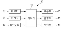 또한, 본 발명에 따르면 제어수단(40)이 상기 검출수단의 신호에 대응하여 설정된 알고리즘으로 완충수단(20)의 저항력을 변동한다. 제어수단(40)은 마이크로프로세서, 메모리, 입출력인터페이스를 탑재하는 제어기(41)를 기반으로 구성된다. 본 발명과 관련된 제어 알고리즘은 서브루틴 프로그램 형태로 메모리에 갱신 가능하게 저장된다. 도 5에서 제어기(41)의 입출력인터페이스를 통하여 연결되는 회로 구성을 예시한다.Further, according to the present invention, the control means (40) varies the resistance force of the buffer means (20) with an algorithm set corresponding to the signal of the detection means. The control means 40 is constituted based on a microprocessor, a memory, and a