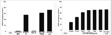 도 2는 본 발명의 바람직한 실시예에 따른 천연추출복합물을 함유한 이너뷰티용 조성물의 항산화 효과를 평가한 그래프.