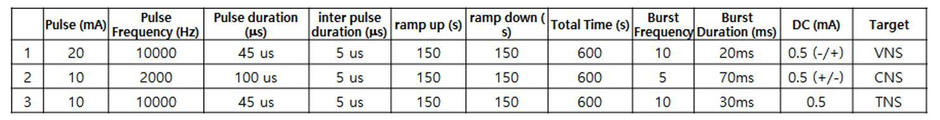 도 5는 신경 조절 장치의 펄스의 버스트 특성과 직류 파형의 특성에 대한 설정과 관련된 표이다.
