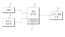 일예로, 도 1은 종래 전자식 도어락의 구성을 블록화하여 개략적으로 나타내는 블록도로서, 종래 전자식 도어락은 도 1과 같이 키패드(1), 전자키감지부(3), 메인제어부(5) 및 도어개폐수단(9)과 같은 구성을 기본적으로 포함하고 있다.