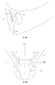 도 9a에는 본 발명의 일 실시예의 사시도가 나타나 있고, 여기에서 유체역학적 덕트는 구상형 선수를 갖춘 선박에 제공되어 있고, 하측 수평방향 벽 부위는 구상부의 상측 표면이고, 이에 반해 도 9b에는 구상형 선수를 갖춘 유체역학적 덕트의 조합에 관한 또 다른 실시예가 나타나 있고, 여기에서 하측 수평방향 벽 부위는 구상 본체의 어느 한쪽 측면 상에 선택된 높이로 뻗어 있다. 상측 수평방향 표면 파동 관리형 벽 부위는 어느 경우에나 수선에 근접하여 구상 본체 위에 위치되어 있다.