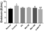 실시예 2의 몰로키아 유래 조다당 분획물의 경우, 실시예 1의 몰로키아 추출물보다 2배 낮은 농도(50 mg/kg)(실험군 3; H-Mol-50)임에도 불구하고 대조군(control)에서 증가한 내독소 농도를 유의미하게 감소하는 것을 확인할 수 있다. 즉 본 발명의 몰로키아 유래 조다당 분획물은 동량의 몰로키아 추출물보다, 알코올에 의한 장 손상을 현저히 억제 및 회복시키므로, 박테리아가 장 내에서 혈류로 빠져나가지 못하도록 하여, 내독소 수치를 유의미하게 현저히 억제함으로써 높은 간 보호 효과를 달성할 수 있다는 것을 알 수 있다.