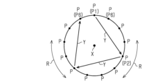 [0031] 도 3 및 도 4는, 유리 다이렉트 로빙(10)의 편측(片側)의 단면에 있어서의, 왕복 이동마다의 유리 스트랜드(GS)의 방향전환점의 둘레방향 위치 P의 변위를 화살표(Y)로 나타낸 설명도이다. 도 3은, 1회의 왕복 이동에 따른 방향전환점의 변위를 나타내고, 도 4는, 방향전환점이 최초의 둘레방향 위치 P로 되돌아올 때까지의 왕복 이동마다의 방향전환점의 변위를 나타낸다.3 and 4 show the displacement of the position P in the circumferential direction of the direction turning point of the glass strand GS for each reciprocating movement in the cross section of one side of the glass direct roving 10 by an arrow (Y) ). Fig. 3 shows the displacement of the turning point according to one reciprocating motion, and Fig. 4 shows the displacement of the turning point for each reciprocating motion until the turning point returns to the initial position P in the circumferential direction.