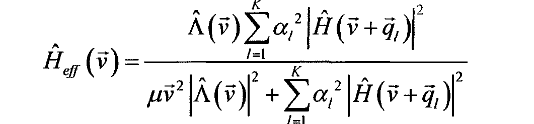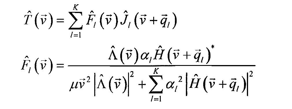 wherein j,(v) represents a pass band that may be provided as input to the filter; f(v) represents a filtered image in the frequency domain that may be obtained as the output of the filter; f(x) represents a function that satisfies /(x)>0 and /(x) = 0 if and only if x = 0; a, represents a weight coefficient associated with a pass band; H(v) ^ ^, v ' represents an optical A(v) presents a frequency bound; μ transfer function; v ' represents a regularization parameter; and, g(x) represents a regularization function.