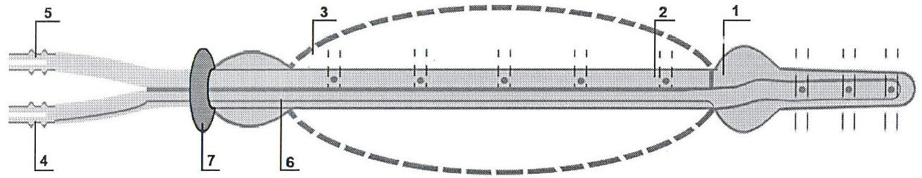 Оно включает в себя ЦЭН, который выполнен цилиндрическим с гладкозакругленным дистальным концом. По оси ЦЭН расположен центральный канал, на боковой поверхности дистального конца расположены радиальные отверстия, сообщающиеся с центральным каналом, а в средней части имеется циркулярно расположенный конический выступ-ограничитель. Канал ЦЭН сообщается с вакуум-трактом двухпросветной трубки (2), изготовленной из диэлектрического гибкого материала, например, из хлорвинила. Двухпросветная трубка проходит сквозь герметично зафиксированный пневмобаллон с эластичной оболочкой, при этом в баро-тракте трубки по длине пневмобаллона трубки имеются радиальные отверстия для пневмоимпульсов, а его дистальный отдел заглушен. Устройство выполнено как единое целое, а в проксимальной части двухпросветной трубки расположен фиксатор, регулирующий глубину введения. На раздвоенных ее концах (вакуум- и баро-трактов) имеются штуцеры (4, 5) с соответствующей маркировкой для соединения шлангами с источником импульсно-периодического давления и вакуума. Штуцер вакуум-тракта (4) и ЦЭН (1) выполнены из токопроводного материала (или ЦЭН содержит металлические обжимные кольца на дистальном конце) и соединены проводом (6), находящимся внутри трубки (2).