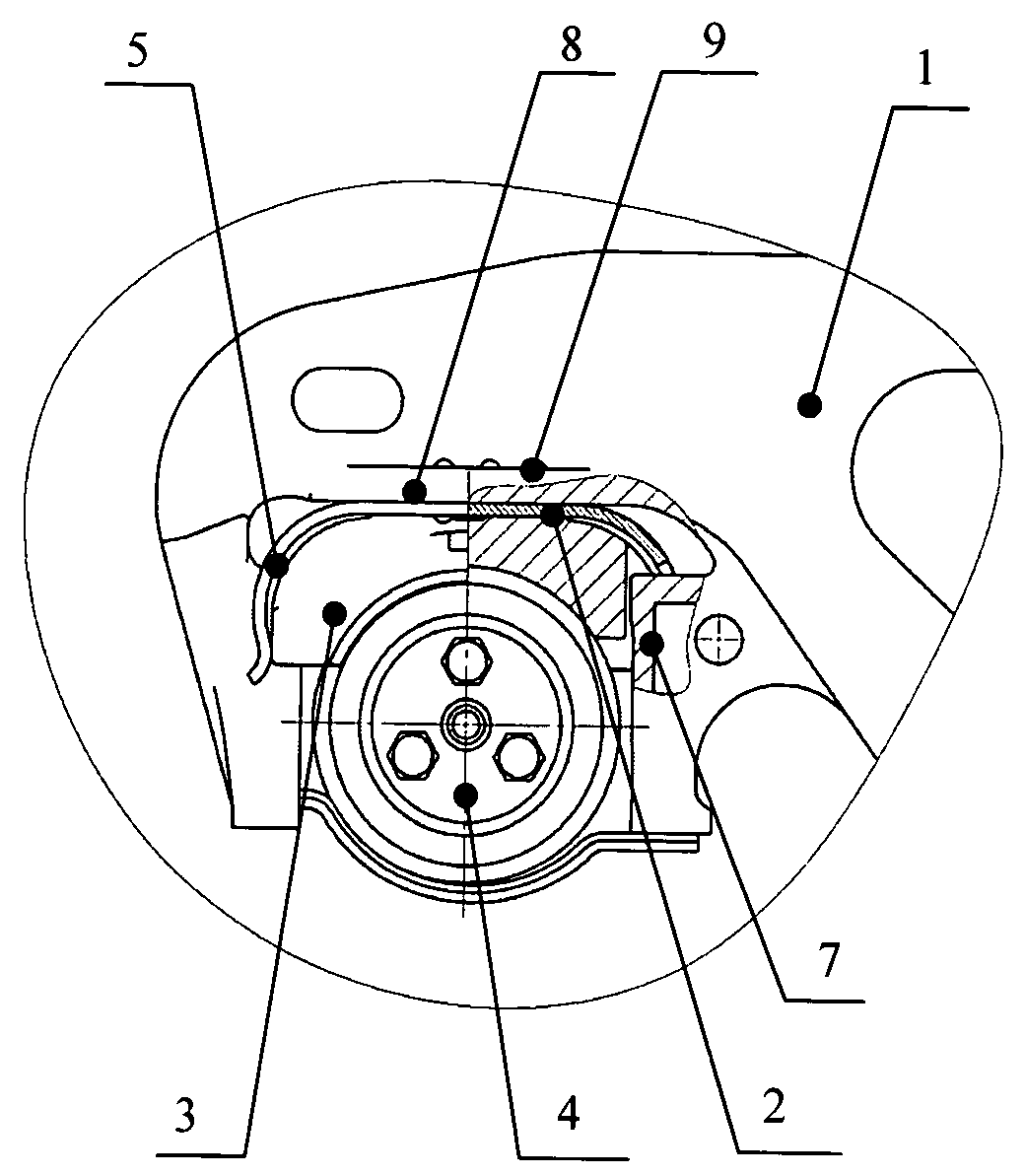 - на фиг.3 показана скоба с видом на вырез захвата. Узел соединения боковой рамы с колесной парой включает боковую раму 1, которая П-образным буксовым проемом через скобу 2 и адаптер 3 опирается на колесную пару с двухрядным кассетным подшипником 4.