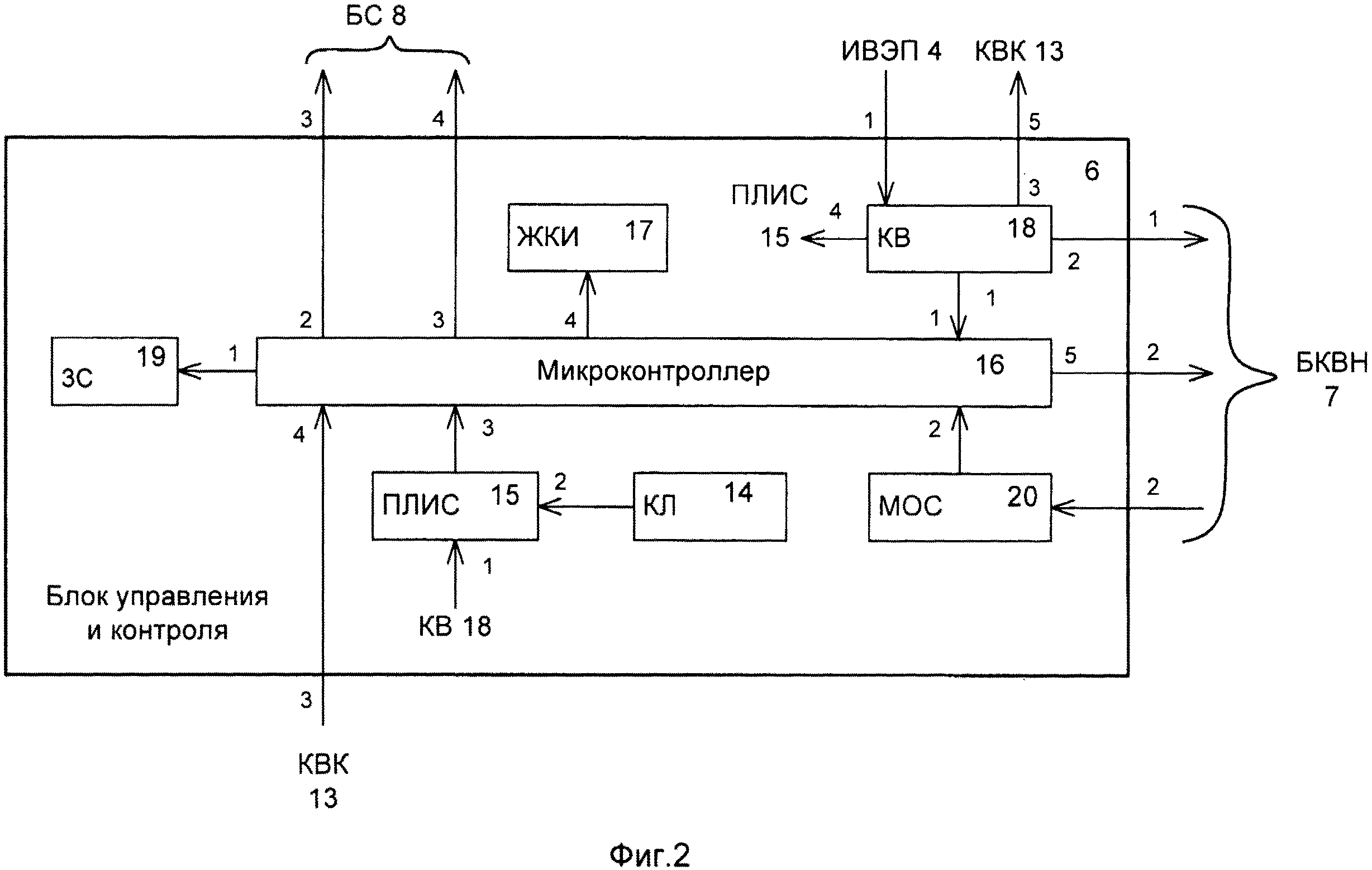 Посредством МК 16 при закрытой крышке 2 корпуса 1 формируют управляющие сигналы для ЗС 19, первых и вторых КВО 30 и 31, ЖКИ 17, РЛ 21 и соответственно для первого и второго КМ 22 и 23 БКВН 7, а также принимают информационные сигналы от МОС 20, КЛ 14 через ПЛИС 15 и от КВК 13.