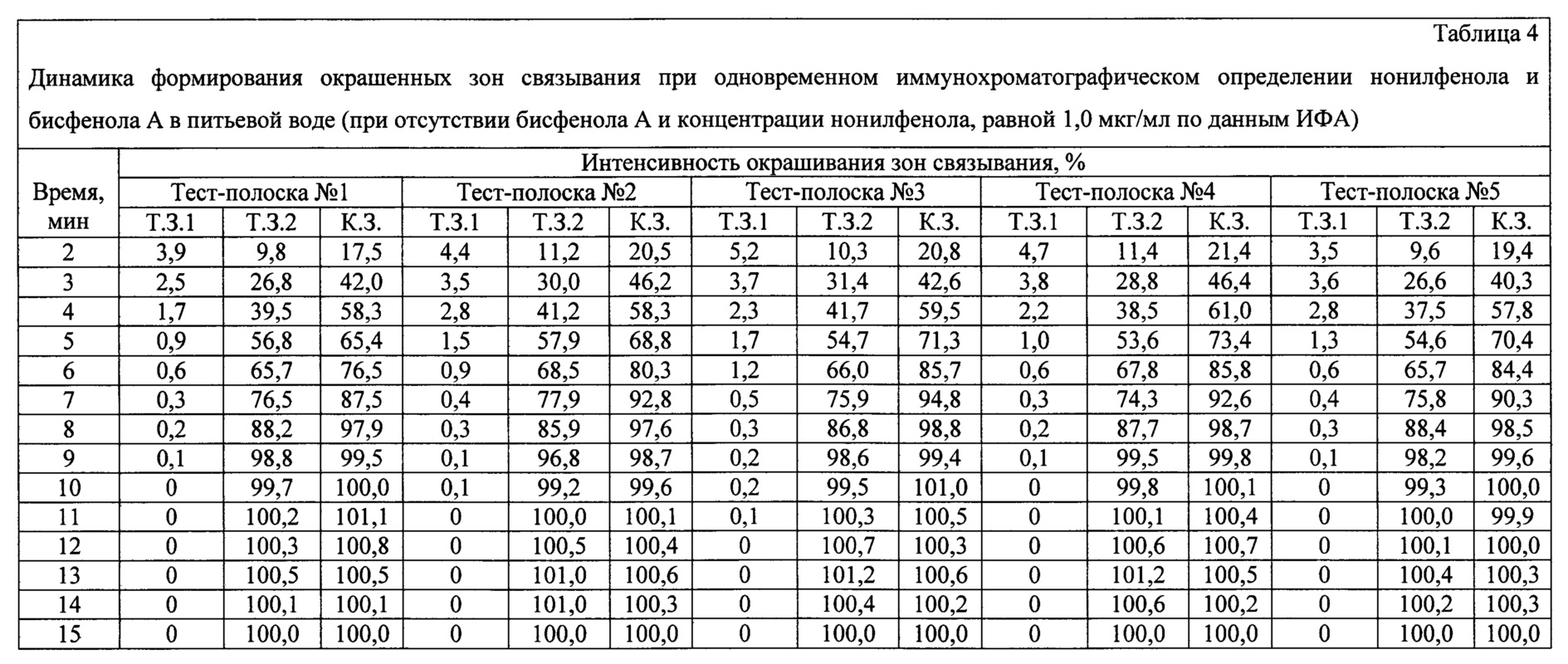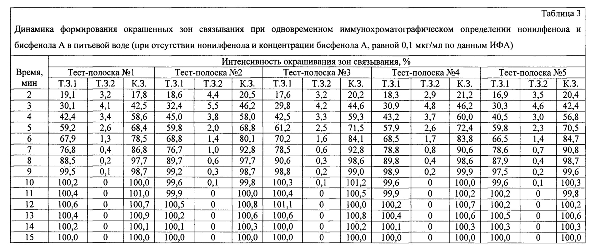 Из приведенных экспериментальных данных видно, что через 10 мин после начала анализа интенсивности окрашивания достигают 99,6-101,0% для контрольных зон (К.З.) и 99,2-99,8% - для тестовых зон связывания бисфенола А (Т.З.2) и практически не изменяются в течение следующих пяти минут. Интенсивности окрашивания тестовых зон связывания нонилфенола (Т.З.1) через 10 мин после начала анализа составляют от 0 до 0,2% и не изменяются в течение следующих пяти минут. Таким образом, время анализа воды, содержащей нонилфенол в концентрации 1,0 мкг/мл и не содержащей бисфенол А по данным ИФА, с использованием заявленного устройства составляет 10 мин.