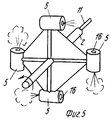 Камеры 5 сгорания размещены на валу 2 попарно и могут быть выполнены как разнесенными (фиг.4), так и совмещенными (фиг.5) в зависимости от конкретного назначения двигателя. Важно, чтобы обеспечивалось совмещение центра масс конструкции с осью вала 2. The