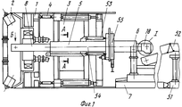 На раме щитового конвейера по обе стороны от конвейерной ленты 15 установлены датчики 47 и 48 положения конвейерной ленты 15, сигналы с которых поступают на электромагниты предохранительных клапанов 44 и 45 с пропорциональным электроуправлением. Рама 14 щитового конвейера снабжена роликами 49 и 50, на которых щитовой конвейер перемещается внутри балки 5. На технологических платформах 7 и 51 установлен магистральный конвейер 52. На балке 5 с возможностью перемещения гидроцилиндрами 53 вдоль продольной оси 54 балки закреплены блокоукладчик 55.