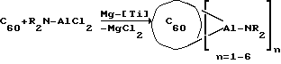 1. Предлагаемый способ базируется на использовании в качестве исходных реагентов диалкиламиналюминийдихлоридов (R2N-AlCl2) и Mg, а в качестве катализатора Cp2TiCl2. В известном способе используются AlEt3 и катализатор Cp2ZrCl2. Кроме того, если в известном способе в ходе реакции образуются 1-этил-2,3-фуллерен[60] алюмациклопентаны (3), то в предлагаемом способе образуются 1-диалкиламин-2,3-фуллерен[60]алюмациклопропаны (1), синтез которых в литературе не описан.