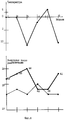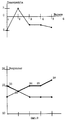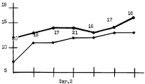 На фиг. 1 представлены результаты реабилитации бицепса правой руки. На диаграммах показаны результаты замеров силовой выносливости мышцы после реабилитации: правая рука с гирей весом 16 кг сгибалась в локтевом суставе до состояния "на отказ". Тонкая ломаная линия отражает результаты пассивной реабилитации, толстая - активной. В обоих случаях первоначальная нагрузка была одинаковой: проводилось сгибание руки в локтевом суставе с гирей весом 16 кг в количестве 10-и раз. Слева от вертикальной линии отражены результаты для реабилитирующего веса 3 кг /ПКН достигается за 4 минуты/, справа - для 5 кг /ПКН - за 2 минуты/. Пассивная реабилитация проводилась за такое же время. Реабилитирующее активное воздействие /сгибание руки в локте/ проводилось на левую руку до состояния ПКН. Цифры под соответствующими точками указывают на количество повторений. Как видно, они не соответствуют тенденциям роста или падения силовой выносливости мышцы после реабилитации, т. к. естественный темп движений в разных тренировках был разный. Из этой и дальнейших фигур видно также, что сопротивление /например, вес гантели/ реабилитирующей нагрузки не имеет существенного значения для результатов реабилитации, от него зависит только время реабилитации. Результаты показали, что изменение времени пассивной реабилитации на минуту или две почти не сказывается на результате реабилитации,