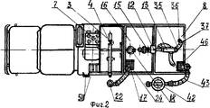Установка также снабжена гидронапорным смесителем 42 с рукавом 43 и трубопроводом 44 со сливным патрубком 45, направленным в полость сетчатой емкости 46, устанавливаемой в верхней части мешалки 8, с измерителем объема 47 жидкости и измерителем объема 48 сыпучих материалов в бункере 16, домкратами 49 для снятия нагрузки с шасси транспортного средства 1 в процессе приготовления растворов, траповыми лестницами 50 и площадками обслуживания 51.