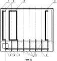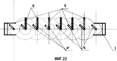 Устройство согласно фиг.22 позволяет сформировать невидимый для наблюдателей волнообразный (см. фиг.23) "экран", по которому перемещаются или на котором зафиксированы показываемые рекламные сообщения. Действительно, при синфазном вращении более чем двух, параллельных валов 3 одинаковые прямые стержни-носители 4 точечных ИС 5 формируют невидимую наблюдателям совокупность цилиндрических поверхностей. Поэтому на всей такой поверхности или на любой ее части можно показывать либо дополняющие одна другую колеблющиеся в пространстве части одного и того же рекламного сообщения, либо, по меньшей мере, однократно волнообразно перемещать рекламное сообщение вдоль "экрана". Естественно, что при соответствующем программном обеспечении направление и/или скорость перемещений рекламных сообщений или их частей можно задавать произвольно.