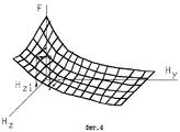 Замеры зазоров в группе радиочастотных датчиков для оценки прямолинейности рельса в горизонтальной плоскости осуществляются несколько иначе. Поскольку проекция рельса на вертикальную плоскость не является симметричной, то "частотно-зазорная" характеристика радиочастотных датчиков 6, 8, 10 может быть описана трехмерной зависимостью (поверхность в трехмерном пространстве), вариант которой представлен на фиг.6. Здесь по оси абсцисс отложены величины рабочего зазора Hy в микронах, по оси аппликат - величина смещения рельса в вертикальной плоскости Hz в микронах, а по оси ординат соответствующая этим зазорам и смещениям частоты сигнала F, который формирует на своем выходе один из радиочастотных датчиков 6, 8, 10. Таким образом, операционный блок 4, измерив текущую частоту сигнала Fi, поступившего от этого радиочастотного датчика, зная его трехмерную "частотно-зазорную" характеристику и величину вертикального смещения рельса Hzi, информацию о котором он только что получил от соседнего датчика "вертикальный" группы (радиочастотные датчики 5, 7, 9), мажет определить величину текущего рабочего зазора Hyi между радиочастотным датчиком и находящейся под ним боковой поверхностью) рельса.