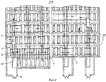 Наличие ярусов, оснащенных продольными путями с ячейками-стоянками, расположенными по обе стороны от продольных путей, позволяет существенно увеличить емкость хранилища и варьировать этот показатель в соответствии с заданием конкретного проекта. Механизация и автоматизация для указанного сооружения правомочна, а наличие нескольких подъемников увеличивает надежность эксплуатации особенно в нештатных ситуациях. Недостатками данной конструкции являются уже отмеченное выше свободное размещение на поддоне автомобилей без возможности закрепления, так как после установки машины на стационарную гребенчатую платформу передвижная гребенчатая платформа убирается из-под машины. Сохраняется и отмеченный выше недостаток, связанный с унифицированными стоянками. Из описания этого изобретения не ясно, с помощью каких механизмов гребенчатая подъемная платформа с автомобилем перемещается с подвижной платформы в ячейку и обратно, во всяком случае это устройство чрезвычайно сложное (перемещения осуществляются в трех измерениях с отделением одной платформы от другой и последующим возвратом).