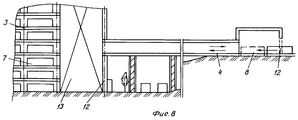 В качестве продольных 4 и поперечных 5 внутренних транспортных путей, кроме рельсовых, изображенных на фиг.3 и 4, могут быть применены рольганги, конвейеры и другие устройства. Для изменения направления движения в местах пересечения продольных и поперечных путей предпочтительно использовать представленное на фиг 4 устройство 6, которое с помощью подвижной части поперечных путей 5* позволяет поднимать или опускать тележку-поддон с автомобилем на высоту, обеспечивающую свободное движение в поперечном направлении без задевания продольных путей, на эту же высоту поперечные пути 5 должны быть расположены выше продольных 4. Для перемещения тележки-поддона 8 с автомобилем внутри гаража могут быть использованы широко известные в технике электромеханические, пневмонические электромагнитные и др. приводы. Как возможный вариант на фиг.4 представлено устройство в виде зубчатых реек 10, закрепленных на тележке-поддоне 8, и системы стационарно установленных по всей длине транспортного пути шестерен 11, вращающихся синхронно, включаемых и отключаемых автоматически. Другим приводом может служить многорядная роликовая цепь, также закрепленная на тележке-поддоне, и система стационарно установленных многорядных звездочек. В качестве привода устройства 6 рационально использовать надежный, малогабаритный, широко распространенный в современной технике пневмопривод, развивающий большие усилия и безопасный в пожарном отношении. Для закрепления автомобиля на тележке-поддоне может быть рекомендован пружинно пневматический привод 9, так как фиксация автомобиля сохраняется весь период нахождения в гараже, то включение и выключение привода осуществляет приемщик при въезде и выезде путем подключения устройства 9 к пневмопитанию легкоразъемным соединением; включив сжатый воздух, с помощью пневмоцилиндра разжимает колодки устройства 9 перед установкой автомобиля на тележку-поддон 8 и при ее выезде.