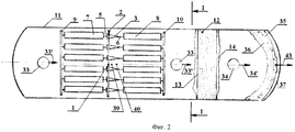 Очищенная вода удаляется из буферной секции 16 через коллектор 35, отбойник 36 и патрубка 43.