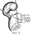 Фиг.2. Культя ДПК взята на держалки. Начало отделения культи.Figure 2. The duodenal stump is taken to the holders. Beginning of stump separation.