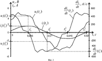 В этом уравнении также два неизвестных: и Аналогичным образом для определения индуктивности решим уравнение (6) для момента времени t2, когда (см. фиг.4), при этом уравнение (6) переходит в уравнение (2). А для определения сопротивления решим уравнение (6) для момента времени t4, когда при этом уравнение (6) переходит в уравнение (4). Благодаря тому, что напряжение реальных силовых трансформаторов остается практически неизменным в различных режимах их работы, изменения индуктивностей рассеяния и активных сопротивлений обмоток указывают на наличие внутренних повреждений, таких как межвитковые замыкания, деформация, снижение усилия прессовки и другие. Поэтому, определив некоторые образцовые значения L1обр, R1обр, L2обр и R2обр для заведомо исправного трансформатора описанным выше способом, задав некоторую уставку ε, определенную эмпирическим путем, и, сравнивая относительное отклонение текущих значений L1, R1, L2 и R2 от образцовых с этой уставкой, можно непрерывно контролировать состояние обмоток трансформатора.There are also two unknowns in this equation: and Similarly for determining inductance solve equation (6) for time t 2 when (see figure 4), while equation (6) goes into equation (2). And to determine the resistance solve equation (6) for time t 4 when while equation (6) goes into equation (4). Due to the fact that the voltage of real power transformers remains almost unchanged in various modes of their operation, changes in the scattering inductances and the active resistances of the windings indicate the presence of internal damage, such as inter-turn faults, deformation, decreased pressing force, and others. Therefore, having determined some exemplary values of L 1 obr , R 1 obr , L 2 obr and R 2 obr for a known-good transformer as described above, setting some setpoint ε determined empirically and comparing the relative deviation of the current values of L 1 , R 1 , L 2 and R 2 from exemplary with this setting, you can continuously monitor the status of the transformer windings.