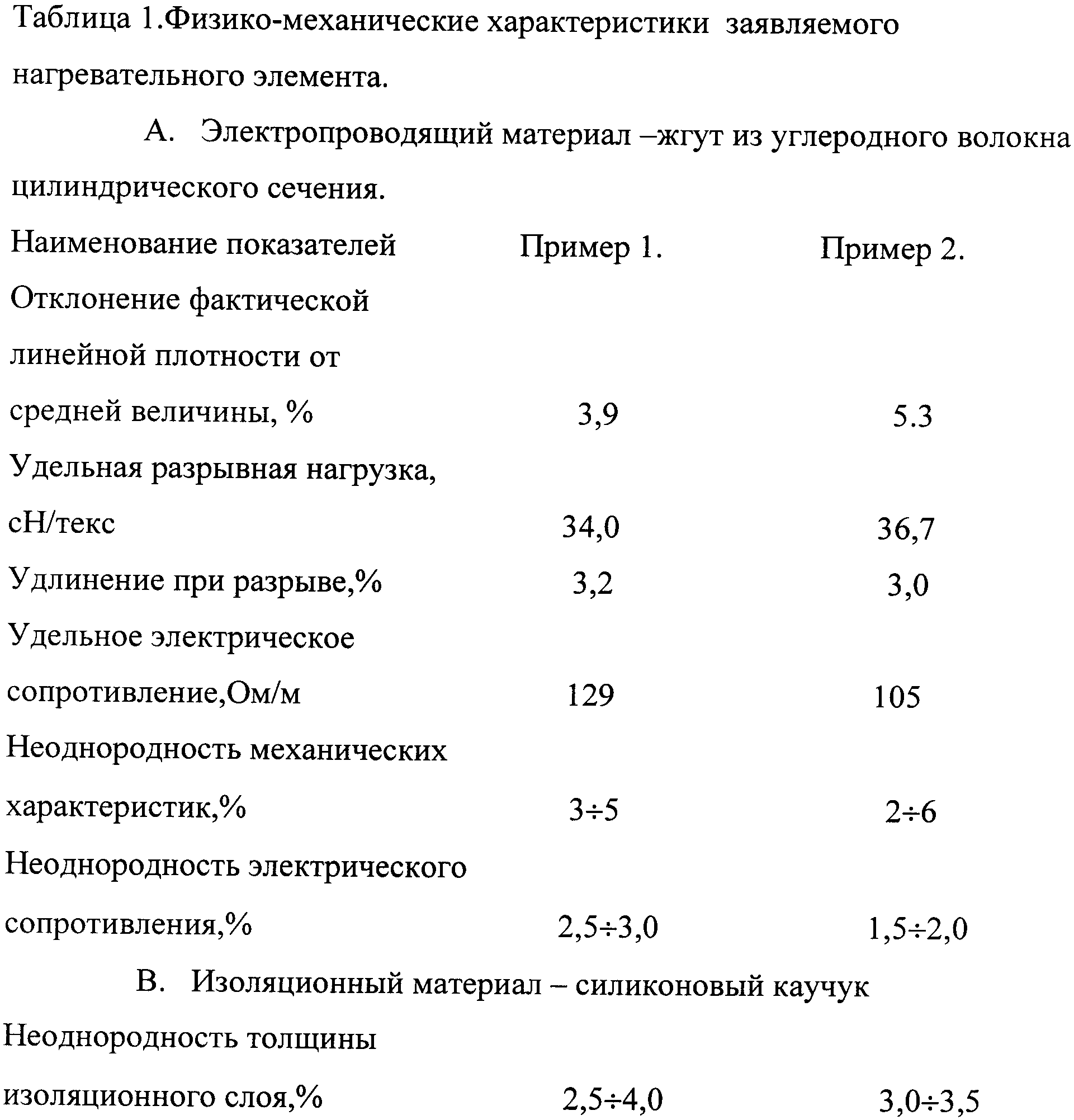Для электропроводящих материалов из углеродного волокна показатели неоднородности физико-механических характеристик колеблются от 1,5 до 50% (Авт. свид. СССР №807389, кл. Н01В 1/04, Бюл. №7, 1981). Показатели неоднородности как электропроводящего, так и изоляционного материала нагревательного элемента, изготовленного заявляемым способом, не превышают 5%.For electrically conductive materials made of carbon fiber, the indices of heterogeneity of physical and mechanical characteristics range from 1.5 to 50% (Auth. Certificate. USSR No. 807389, class N01B 1/04, Bull. No. 7, 1981). The heterogeneity of both the electrically conductive and the insulating material of the heating element made by the claimed method does not exceed 5%.