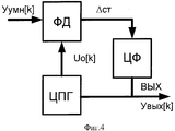 Структурная схема ЦСФС представлена на фиг.4. Она включает в себя фазовый дискриминатор ФД, выделяющий разность фаз входного уумн[k] и опорного U0[k] сигналов ЦСФС, цифровой фильтр ЦФ, определяющий порядок и свойства ЦСФС, и цифровой подстраиваемый генератор опорного колебания (выходной сигнал ЦПГ U0[k] представляет собой последовательность дискретных отсчетов опорного гармонического колебания, в случае системы 1-го порядка цифровой фильтр ЦФ представляет собой умножитель на некоторый фиксированный коэффициент α). Первоначально частота опорного сигнала U0[k] выбирается равной частоте fн тестового сигнала. Как показано в работе [5], в случае, когда значение частоты присутствующего в смеси сигнала с шумом уумн[k] гармонического колебания отличается от частоты fн на величину frДЭ, в установившемся режиме работы ЦСФС выходной сигнал Δст ее фазового дискриминатора:The structural diagram of the CSPS is presented in figure 4. It includes a phase discriminator of the PD, which distinguishes the phase difference of the input of the smart [k] and reference U 0 [k] signals of the DSPF, a digital filter of the DF that determines the order and properties of the DSPF, and a digital tunable reference oscillator (the output of the CPG U 0 [ k] is a sequence of discrete samples of the reference harmonic oscillation; in the case of a first-order system, the digital filter of the digital filter is a multiplier by some fixed coefficient α). Initially, the frequency of the reference signal U 0 [k] is selected equal to the frequency f n of the test signal. As shown in [5], in the case when the frequency of the signal present in the mixture with noise at the smart [k] harmonic oscillation differs from the frequency f n by the value f rDE , in the steady-state operation mode of the DSSF, the output signal Δ st of its phase discriminator: