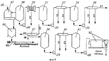 Жидкая фаза питательным насосом 49 подается в фильтр-пресс 50 с рабочим давлением 0,3 МПа и фильтруется до достижения в жидкой фазе низкомолекулярной взвеси не более 1,0%. Отфильтрованную жидкую фазу из сборной емкости фильтр-пресса 50 напорным насосом 52 направляют на микрофильтрационную установку 53, где фильтрацию жидкой фазы ведут при рабочем давлении 0,3 МПа с рабочими размерами пор фильтрующих трубчатых керамических элементов 0,5-1,0 мкм до содержания не более 1,0% низкомолекулярной взвеси при регулируемой температуре 45°С.