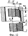 В каждом конкретном случае оптимальный натяг подбирается экспериментальной обработкой и в среднем должен составлять - i=0,7…2,5 мм [3]. В процессе обработки впадины заготовки червяка пучки ворса прижимаются к заготовке и прогибаются благодаря натягу i (фиг.12). На величину силового воздействия на обрабатываемую боковую поверхность зуба будет влиять длина вылета (l+i) проволочного элемента. Основное силовое воздействие на обрабатываемую поверхность осуществляется первыми по ходу вращения проволочными элементами, имеющими наибольшие свободную длину l и прогиб f. Соседние с ними проволочные элементы упруго поджимают их, несколько увеличивая сосредоточенное суммарное воздействие на обрабатываемые поверхности.