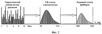 фиг.2 - последовательность спектров сигналов: 1) энергетический спектр излучения отклика, 2) спектр ультрафиолетового преобразования энергетического спектра сцинтилляционными пластинами, 3) спектр видимого диапазона на выходе файберов;figure 2 is a sequence of signal spectra: 1) the energy spectrum of the response radiation, 2) the ultraviolet conversion spectrum of the energy spectrum with scintillation plates, 3) the spectrum of the visible range at the output of the fibers;