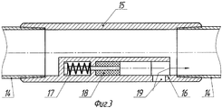 В процессе работы устройства в определенном интервале происходит прорыв теплоносителя, например, при температуре 90°C через фильтр 7 в горизонтальный участок 4 добывающей скважины 2, при этом температура перепускаемой через температурный клапан 15 (см. фиг.1 и 2) жидкости находится в интервале 45°C-81°C, поэтому расширяющийся материал 18 нагревается и начинает увеличиваться в продольном направлении, и, растягивая пружину 17, частично перекрывает седло 16 температурного клапана 15. При превышении температуры 81°C входное отверстие 19 температурного клапана 15 полностью закрывается. В зависимости от длины интервала прорыва теплоносителя в горизонтальный участок 4 добывающей скважины могут закрыться как один, так и несколько температурных клапанов 15.During operation of the device in a certain interval, the coolant breaks down, for example, at a temperature of 90 ° C through the filter 7 into the horizontal section 4 of the production well 2, while the temperature of the liquid bypassed through the temperature valve 15 (see FIGS. 1 and 2) is in the range 45 ° C-81 ° C, so the expanding