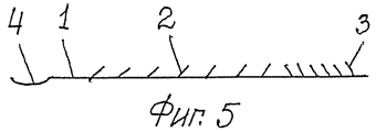 На фиг.5 схематично показана нить 1 с иглой 4 аналогично фиг.1 и 2 для зашивания раны непрерывным швом. Нить выполнена с выступами фигурного дизайна 2 и 3.Figure 5 schematically shows a