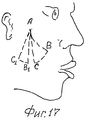Другой вариант применения шовного материала изображен на фиг.11. Обоюдоострой иглой 15, составленной из игл 16 и 17, производят единый прокол в точке «А» (см. фиг.17) в верхней части скуловой области, нить 18, прикрепленная к игле 16 с фигурными выступами, направляется по треугольному контуру «А», «В», «С», а игла 15 со второй половиной нити 18 по другому контуру «A1», «В1», «C1» с выколами и поворотами игл. При этом выступы фигурного дизайна прогибаются, вкладываются в донорское ложе нити, откуда они вырезаны, и после возвращения игл и их выведения в точку «А» и наложения узла надежно фиксируют ткани в новом повышенном положении.Another application of suture material is shown in Fig.11. Double-edged
