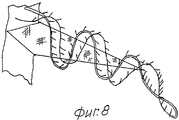 На фиг.7 и фиг.8 изображены варианты зашивания ран нитями в два этажа. Один вариант (фиг.7) - двумя нитями, второй вариант (фиг.8) - одной нитью с различным направлением фигурных выступов.In Fig.7 and Fig.8 depicts options for suturing wounds with threads in two floors. One option (Fig.7) - two threads, the second option (Fig.8) - one thread with a different direction of curly protrusions.