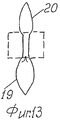 Еще один вариант применения шовного материала показан на фиг.12 и фиг.13. Операции выполняются следующим способом. Этот способ применяется для сшивания ран, требующих усилий для сведения краев раны 19 и 20, обоюдоострую иглу 21 с нитью с наклонными выступами фигурного дизайна вкалывают любым острием на определенной глубине в один из краев раны, затем иглу 21 с нитью продвигают параллельно коже перпендикулярно краю раны на необходимое удаление от края раны, далее острие направляют на поверхность кожи, но не выводят, полностью оставляя второе острие примерно на глубине прохождения нити, и, поворачивая иглу на угол 90°, продолжают выполнять прямоугольный стежок, затем то же выполняют на другом краю раны, концы нити связывают между собой.Another application of suture material is shown in Fig.12 and Fig.13. Operations are performed as follows. This method is used for stitching wounds that require effort to reduce the edges of the
