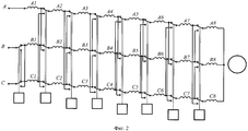 Эта трехфазная полюсопереключаемая обмотка на четыре числа пар полюсов (двухслойная, трехзонная, соединенная в звезду с одной параллельной ветвью в каждой фазе при всех числах пар полюсов) состоит из одинаковых равномерно распределенных катушек, входящих в катушечные группы с номерами А1 - А8, В1 - В8, С1 - С8. При указанном на фиг.2 исходном положении переключателей схема подготовлена для включения обмотки на 8 пар полюсов (подвижные контакты переключателей катушечных групп расположены вверху), а включение производится подачей трехфазного напряжения на входные зажимы обмотки, обозначенные буквами А, В и С.