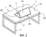 В качестве дисплея 2 могут использоваться, например, планшетные компьютеры, имеющие прозрачное защитное покрытие 203 (фиг.3) в виде пластины (листа), предпочтительно из армированного стекла. Дисплей 2 расположен поверх панели-крышки 3 и закреплен на ней с обеспечением возможности поворота посредством механизма 6 поворота, снабженного приводом 7, вокруг оси 8, параллельной как верхней поверхности 101 столешницы, так и расположенной вблизи этой оси 8 нижней боковой стороне 202 дисплея 2, обращенной к соответствующей ему передней боковой стороне 102 столешницы.As the