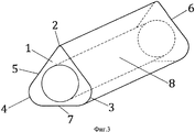 На фиг. 1 показан вариант, в котором корпус 1 самомассажного устройства выполнен в форме удлиненной трехгранной призмы с гранями 2, 3 и 4, имеющими разные радиусы скругления, и с плоскими участками 5, 6 и 7, имеющими разные площади поверхностей, причем сам корпус 1 выполнен монолитным и полнообъемным.In FIG. 1 shows an embodiment in which the