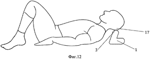 Фиг. 15 - положение человека и устройства при самомассаже мышц брюшного пресса и органов брюшной полости.FIG. 15 - the position of the person and the device during self-massage of the abdominal muscles and organs of the abdominal cavity.