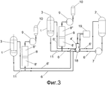 Вход насоса высокого давления 7 соединен с выходом емкости 2 для компонентов без твердого наполнителя, а его выход - со смесительным узлом 4. Подача компонента с наполнителем в виде пульпы происходит с помощью гидравлического разделителя сред 8. Гидравлический разделитель сред 8 имеет рабочую полость 8′ и нагнетательную полость 8′′. Необходимое давление в гидравлическом разделителе сред 8 создают с помощью насоса высокого давления 9 посредством жидкой среды, хранящейся в емкости 10. Применяемый разделитель сред 8 может быть поршневым, баллонным, мембранным или сильфонным. Выход емкости 1 соединен с рабочей полостью 8′ гидравлического разделителя сред 8 и далее со смесительным узлом 4 или 4′ (Фиг. 3) Для исключения повышения давления в емкости 1 и для управления направлением потока трубопровод 6 снабжен клапанным устройством 11. Нагнетательная полость 8′′ разделителя сред соединена с выходом насоса высокого давления 9, а его вход соединен с емкостью 10.