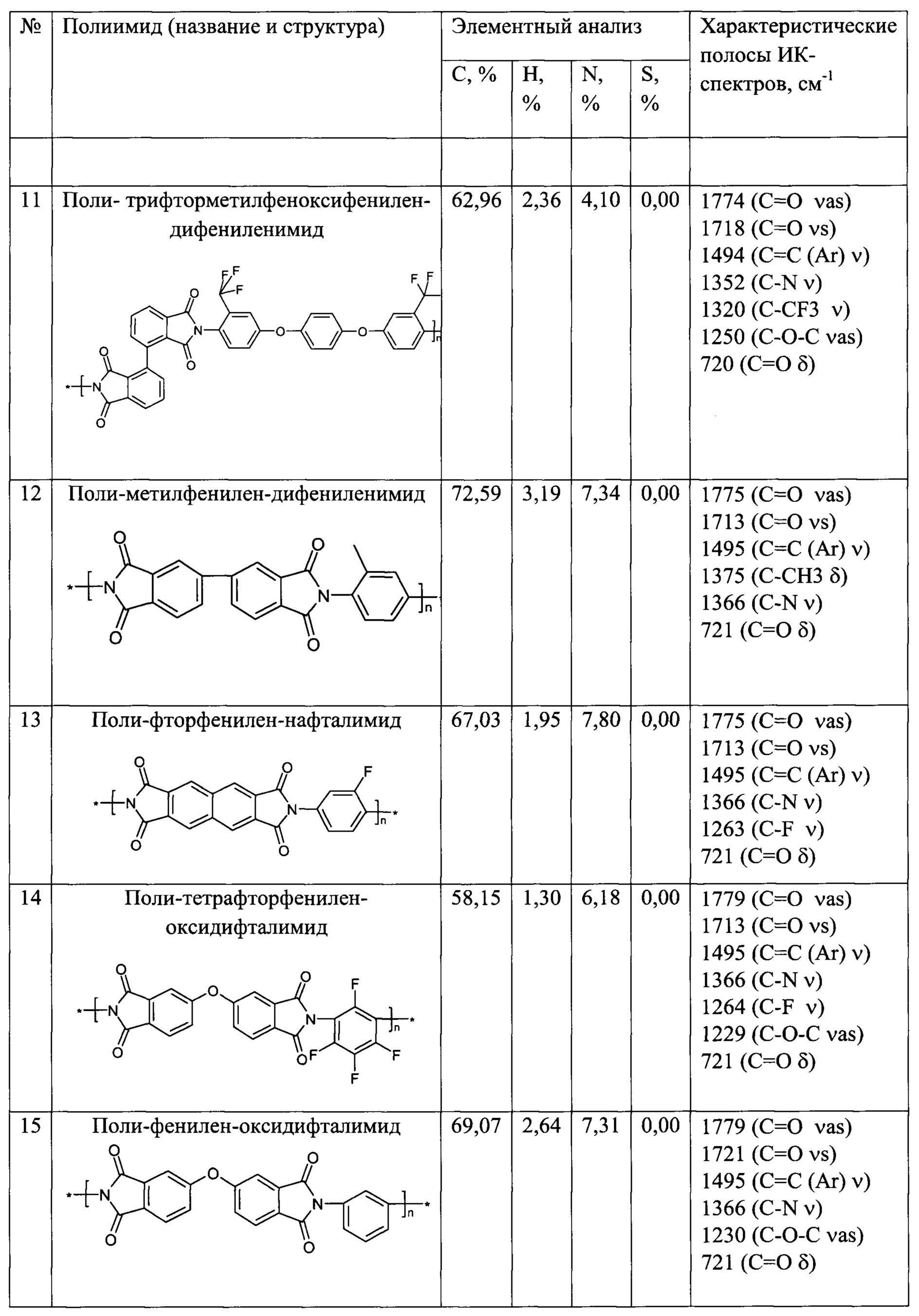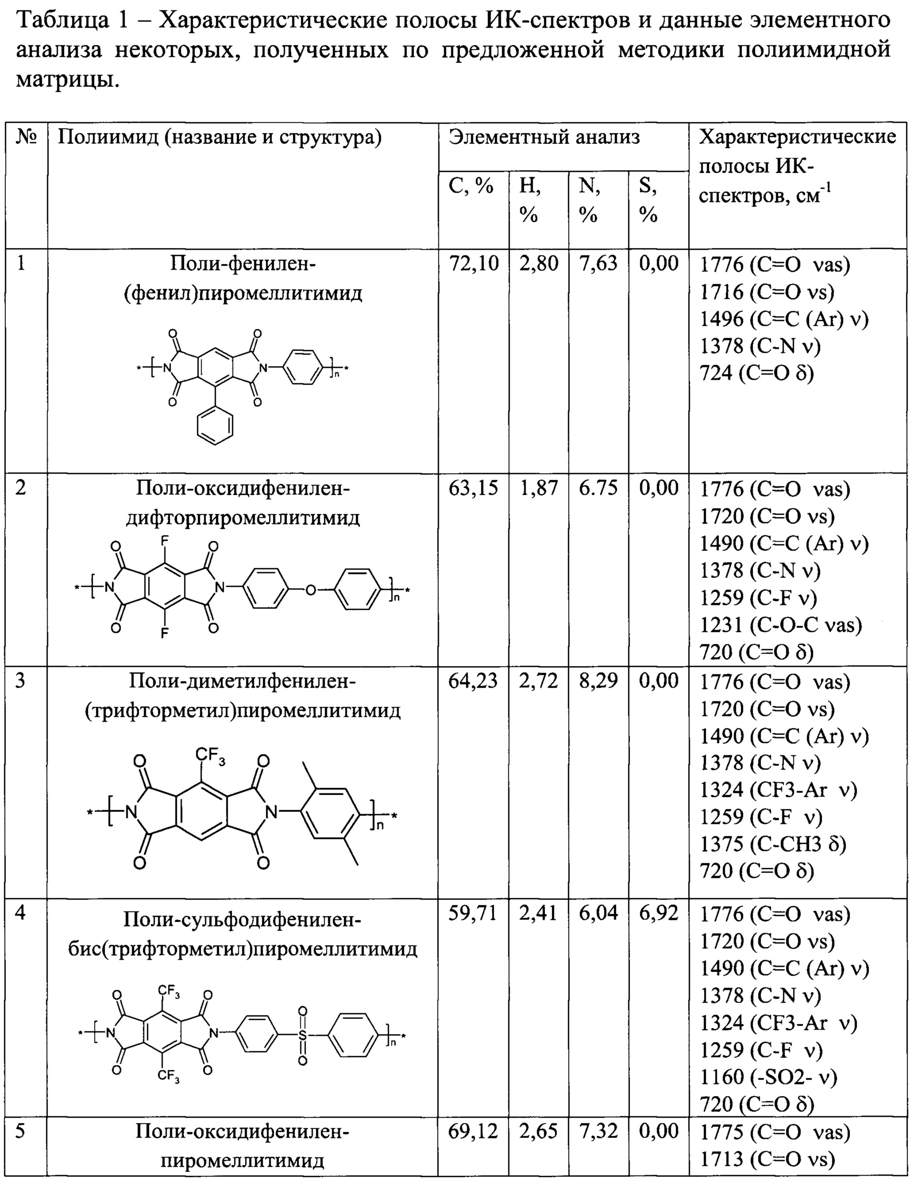 Аналогично при этих же условиях получают композиты с полиимидными матрицами, приведенными в Таблице 1, где приводятся - характеристические полосы ИК-спектров и данные элементного анализа некоторых, полученных по предложенной методике.
