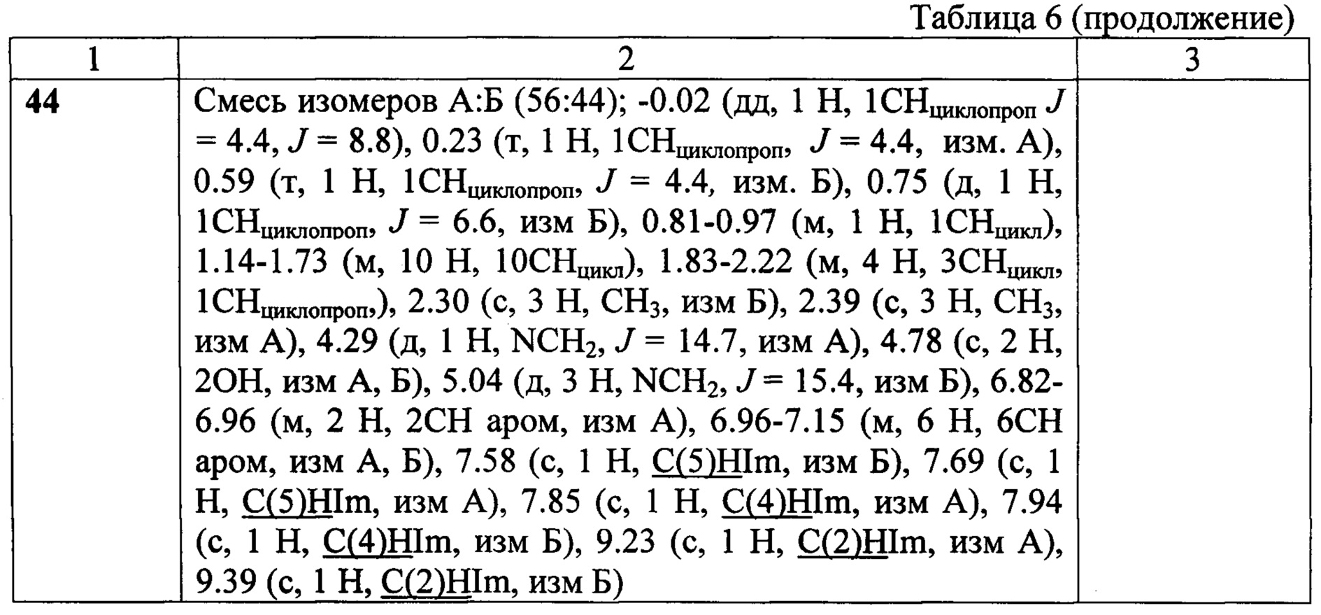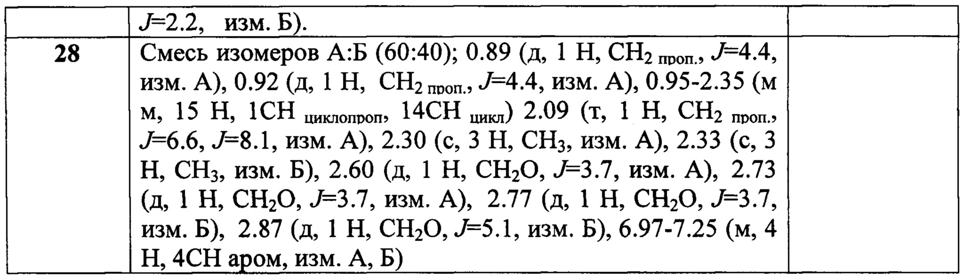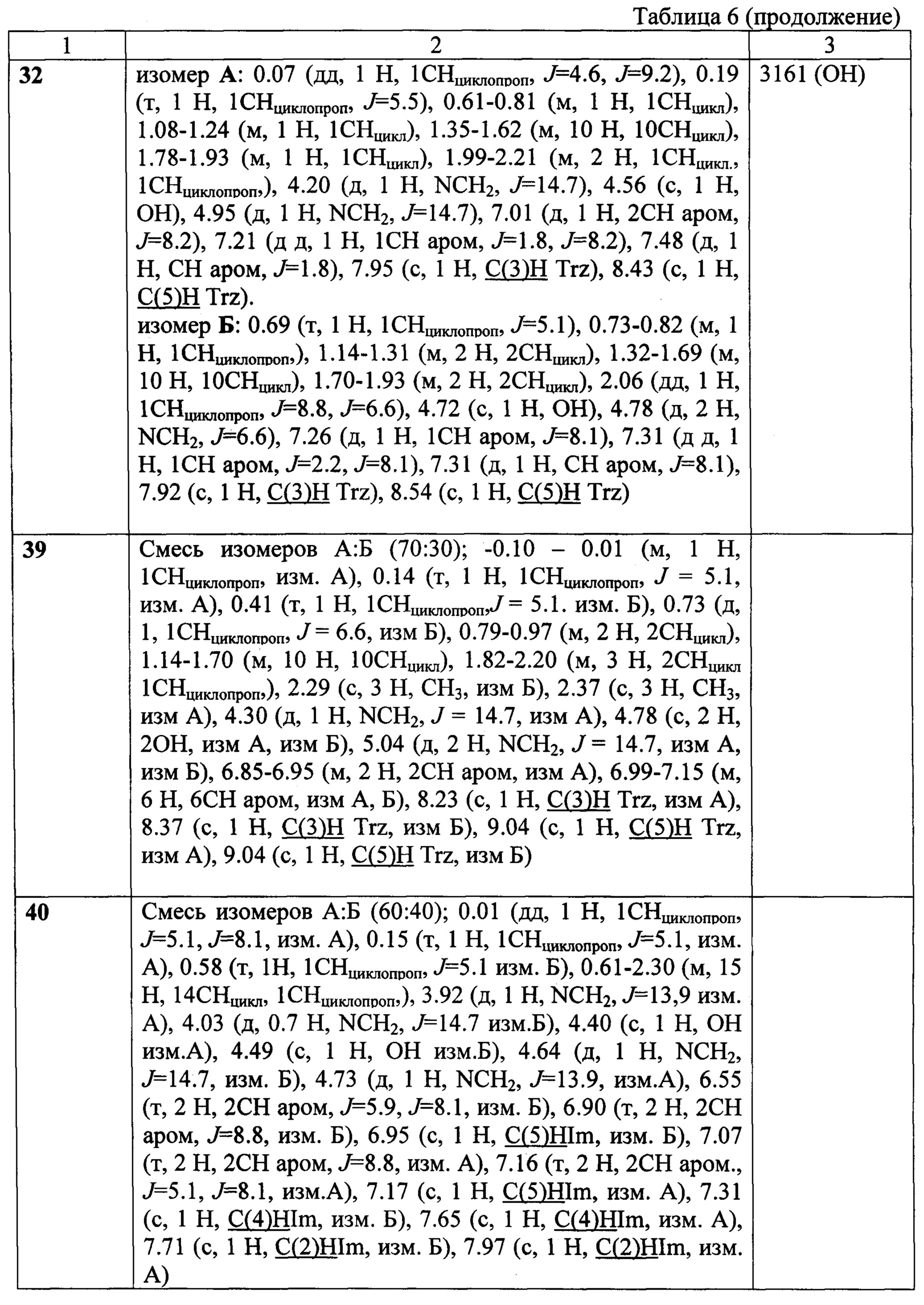 изомер Б: 0.69 (т, 1 Н, 1СНциклопроп, J=5.1), 0.73-0.82 (м, 1 Н, 1CHциклопроп,), 1.14-1.31 (м, 2 Н, 2СНцикл), 1.32-1.69 (м, 10 Н, 10СНцикл), 1.70-1.93 (м, 2 Н, 1CHцикл), 2.06 (дд, 1 Н, 1СНцикдопроп, J=8.8, J=6.6), 4.72 (с, 1 Н, ОН), 4.78 (д, 2 Н, NCH2, J=6.6), 7.26 (д, 1 Н, 1СН аром, J=8.1), 7.31 (д д, 1 Н, 1СН аром, J=2.2, J=8.1), 7.31 (д, 1 Н, СН аром, J=8.1), 7.92 (с, 1 Н, С(3)Н Trz), 8.54 (с, 1 Н, С(5)Н Trz)
