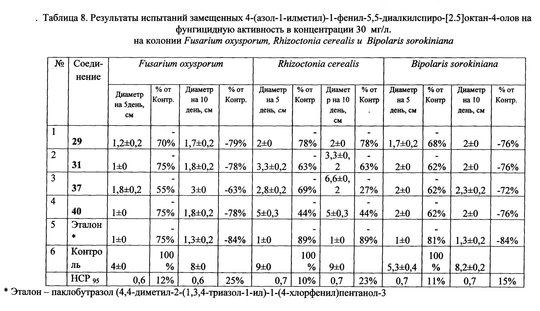 Действие препаратов на радиальный рост мицелия определяли растворением композиции соединения - замещенного 4-(азол-1-илметил)-1-фенил-5,5-ди-алкилспиро-[2.5]октан-4-ола в диметилсульфоксиде в концентрации 10 мг/л и внесением аликвоты в картофеле-глюкзный агар (КГА) при 50°С до концентрации 30 мг/л по действующему веществу. Фитопатогенные грибы были предварительно выращены на КГА в течение 10 дней при температуре (20-22°С), при рассеянном освещении. Спустя 10 дней роста культуры, из края сформировавшейся колонии гриба микрошпателем вырезали блок размером 4×4 мм и переносили, с соблюдением условий стерильности, в центр опытных чашек Петри со средой. Повторность трехкратная. Инокулированные чашки оставляли в указанных условиях в течение 5 или 10 дней. После этого измеряли диаметр образовавшихся колоний в двух взаимно перпендикулярных направлениях. Процент ингибирования рассчитывали по Эбботу по отношению к необработанному контролю.. Результаты испытаний представлены в таблице 8.