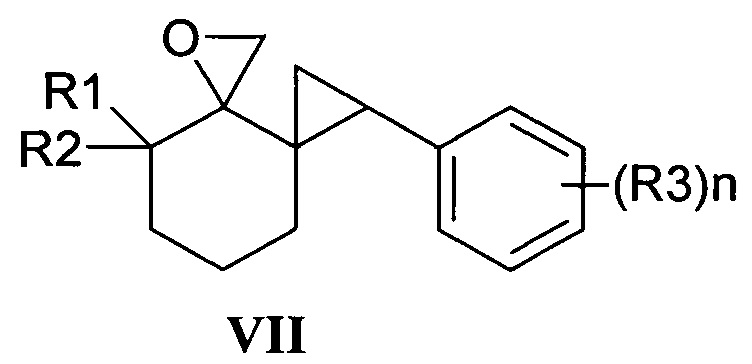 в полярных апротонных растворителях, с образованием замещенных 10,10-диалкил-5-фенил-1-оксадиспиро[2.0.2.4]деканов общей формулы VII, где R1, R2 и R3 имеют те же значения, что и в формуле I
