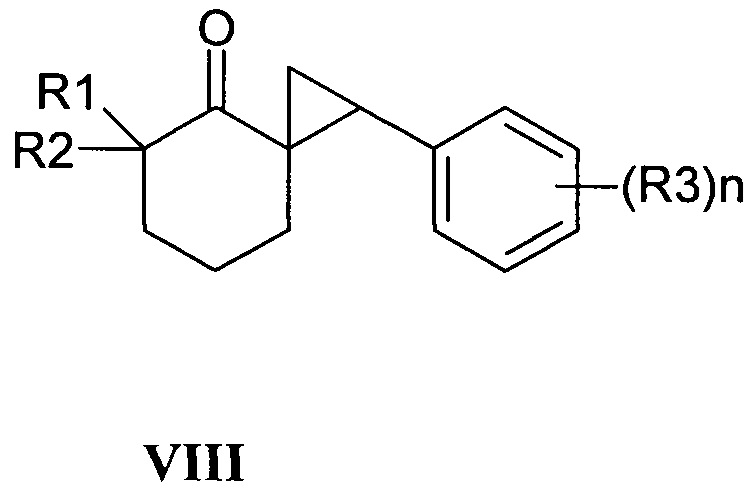в полярных апротонных растворителях, с образованием замещенных 5,5-диалкил-1-фенил-спиро[2.5]октан-4-онов общей формулы VIII, где R1, R2 и R3 имеют те же значения, что и в формуле I,