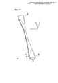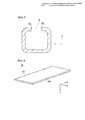 [0008] Способ изготовления детали автомобиля в виде рычага, в соответствии с настоящим изобретении, который успешно решает упомянутую выше проблему, представляет собой способ, предназначенный для изготовления детали автомобиля в виде рычага, имеющей полый профиль с открытым поперечным сечением, путем обработки заготовки, которая представляет собой плоскую пластину, проходящую в первой плоскости, образованной первым направлением и вторым направлением, перпендикулярным первому направлению, поэтапной штамповкой так, что две боковых поверхности заготовки во второй плоскости, образованной первым направлением и третьим направлением, перпендикулярным первой плоскости, обращены одна к другой через зазор, причем способ включает этап правки, в котором выступ, расположенный на правочном штампе, который должен проходить в первом направлении, размещают в указанном зазоре между указанными двумя боковыми поверхностями, обращенными одна к другой, и две боковых поверхности вводят в контакт с указанным выступом, так что заготовку обжимают от наружной периферии к внутренней периферии.