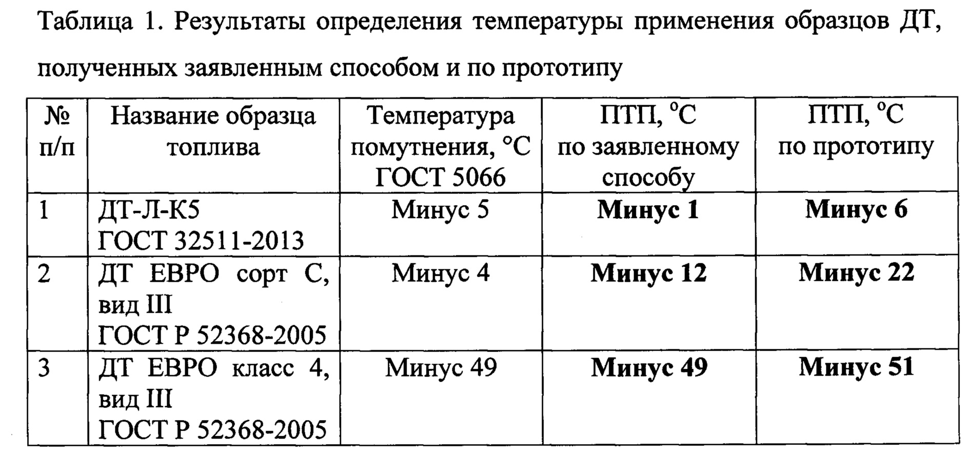 Из таблицы 1 видно, что полученные по заявляемому способу значения предельные температуры применения для образцов топлива №1 - №3 отличаются от температур применения, полученных по прототипу, на 2-10°С. Для летних ДТ (образцы №1 и №2), содержащих в составе до 50% масс н-парафинов, ПТФ нижнего слоя топлива оказалась выше на 4-8°С температуры помутнения исходного ДТ, определенной по стандарту ГОСТ 5066.